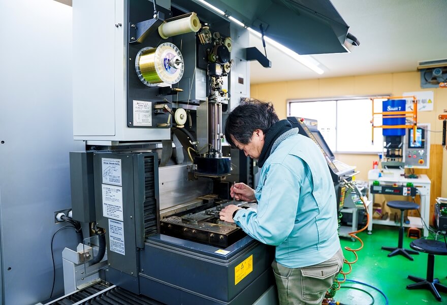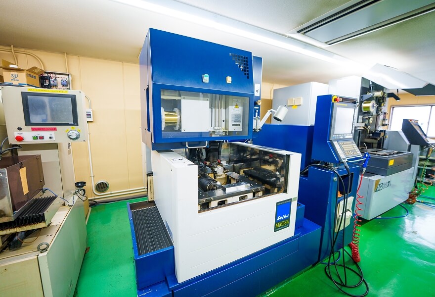 ワイヤー放電加工機は、電気エネルギーで金属を非接触加工し、複雑形状や微細寸法をミクロン単位で高精度に仕上げる設備です。