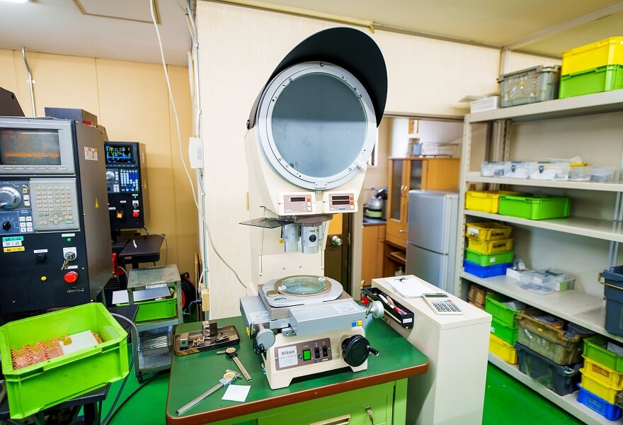 投影機は、加工部品を拡大投影し、形状や寸法を非接触で測定する検査設備です。
